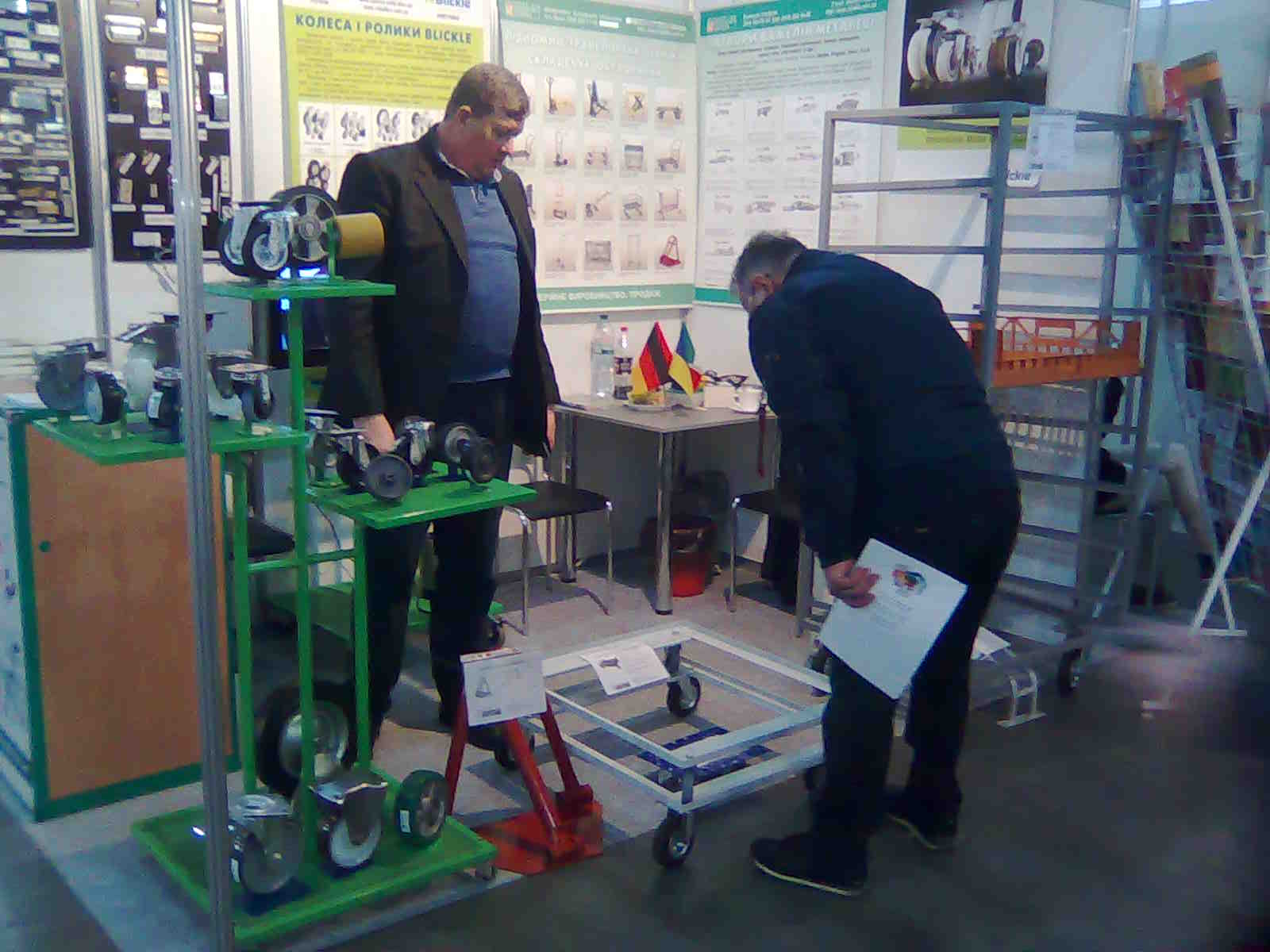 На нашому стенді було продемонстровано ряд виробів та комплектуючих до складської техніки, що застосовується на складах, магазинах, цехах у різних підгалузях харчової та переробної промисловостях, а це візки, колеса, контейнери, кріпильна фурнітура, тощо.